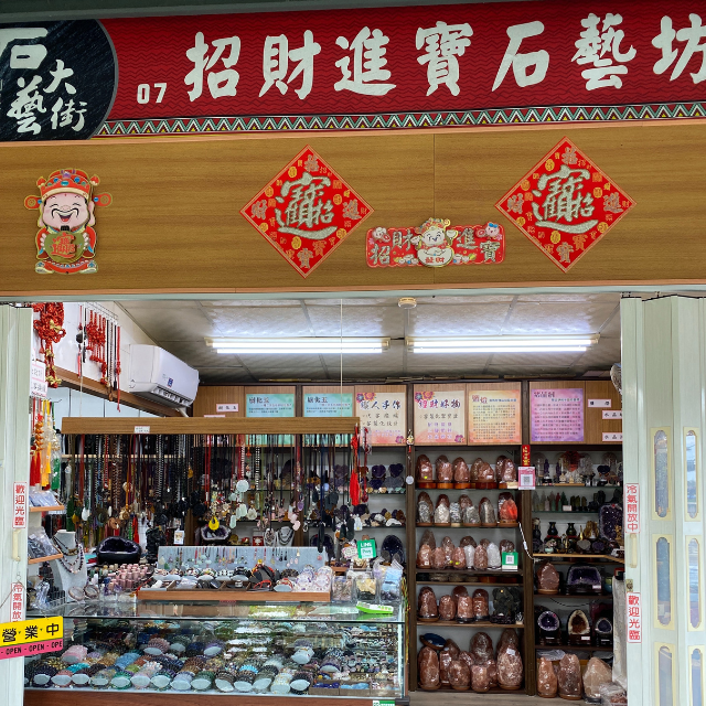 以華人文化中吉祥、喜氣的成語「招財進寶」作為品牌名稱,象徵吉祥與好運的到來。石藝坊主要提供天然寶石、水晶、手工藝品,希望為顧客帶來美感與能量。 花蓮也是臺灣玉石重要產地,石藝坊精選多款天然水晶,多種尺寸與造型的晶洞、晶球、晶柱,以及含微量礦物質的喜馬拉雅山鹽燈等,療癒的氛圍與特色玉石產品,為顧客增添生活美學,為大家帶來平衡、祝福與好運。